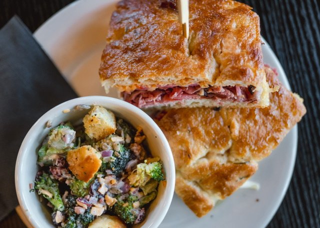 Crisp, bite-sized broccoli florets tossed with red onion, smoky bacon, sunflower seeds and dried cranberries, all folded into a slighly sweet, tangy house-made creamy dressing. Served cold. Full salads are served over a bed of chilled citrus-dressed rotini pasta.